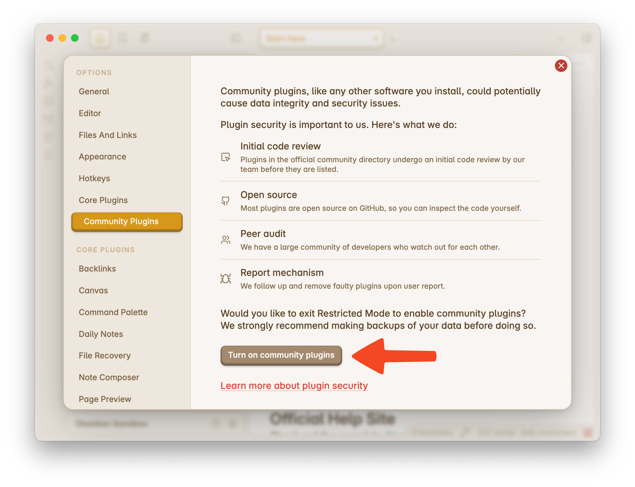 If you see the following screen, click Turn on community plugins, then try clicking the install button again.