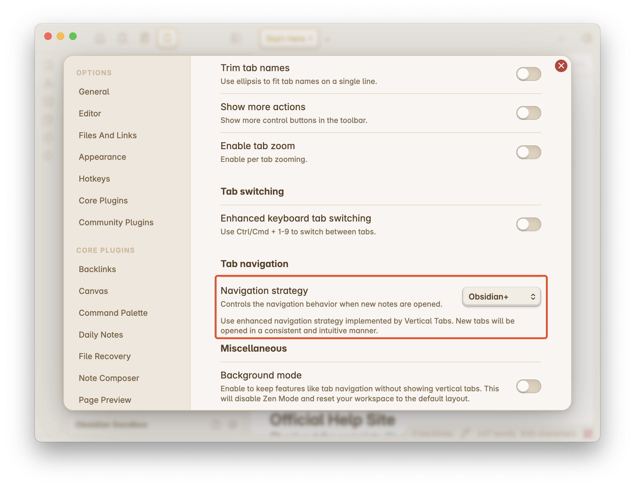 Tab navigation controls the location of newly-opened tabs. By default, when you open a new note, Obsidian will replace your current note, similar to a web browser. If this is not what you want, you can choose or design your own tab navigation strategy in the settings.