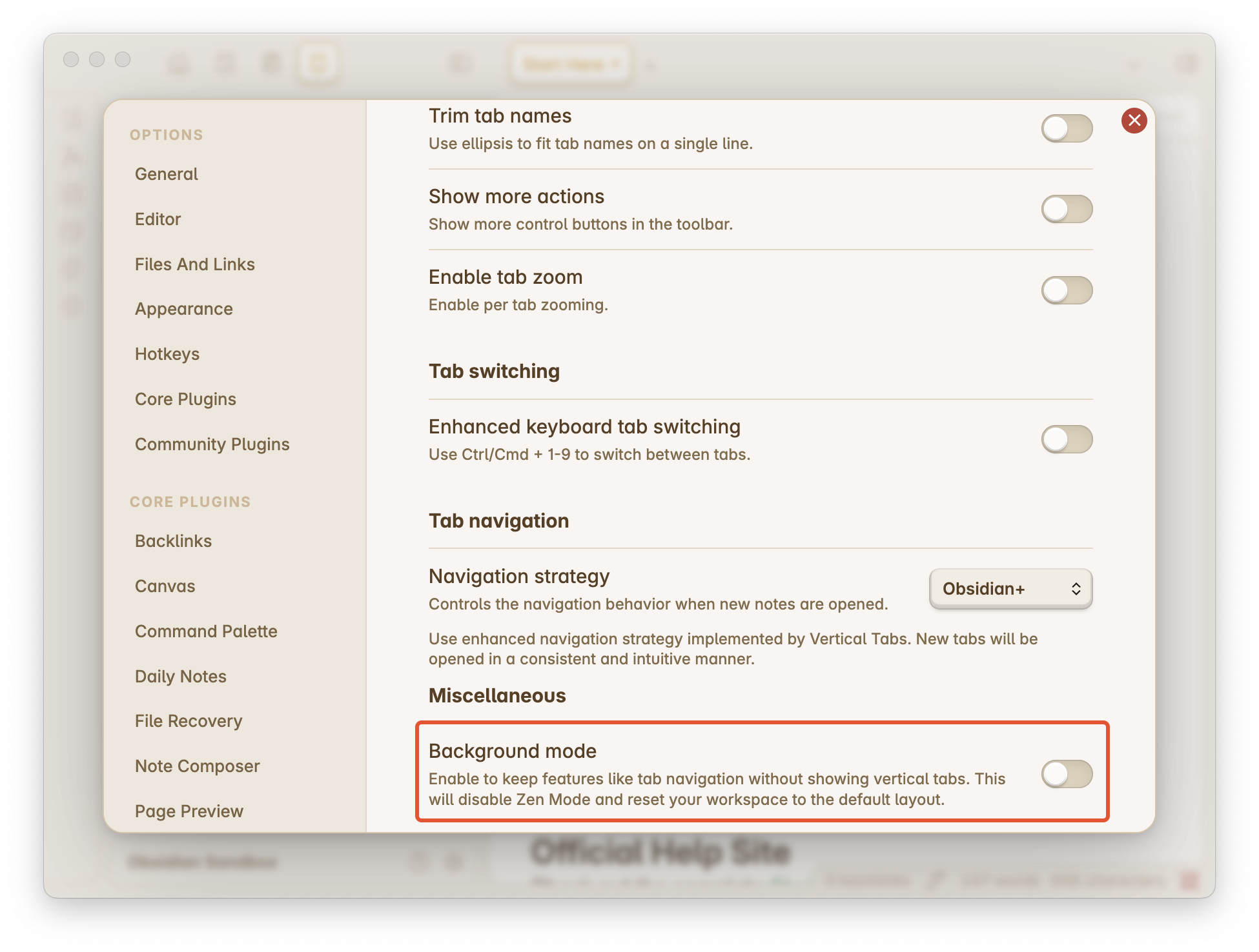 By enabling the background mode, you will lose access to most features of Vertical Tabs — you cannot even see Vertical Tabs. Make sure this is intentional before enabling it.