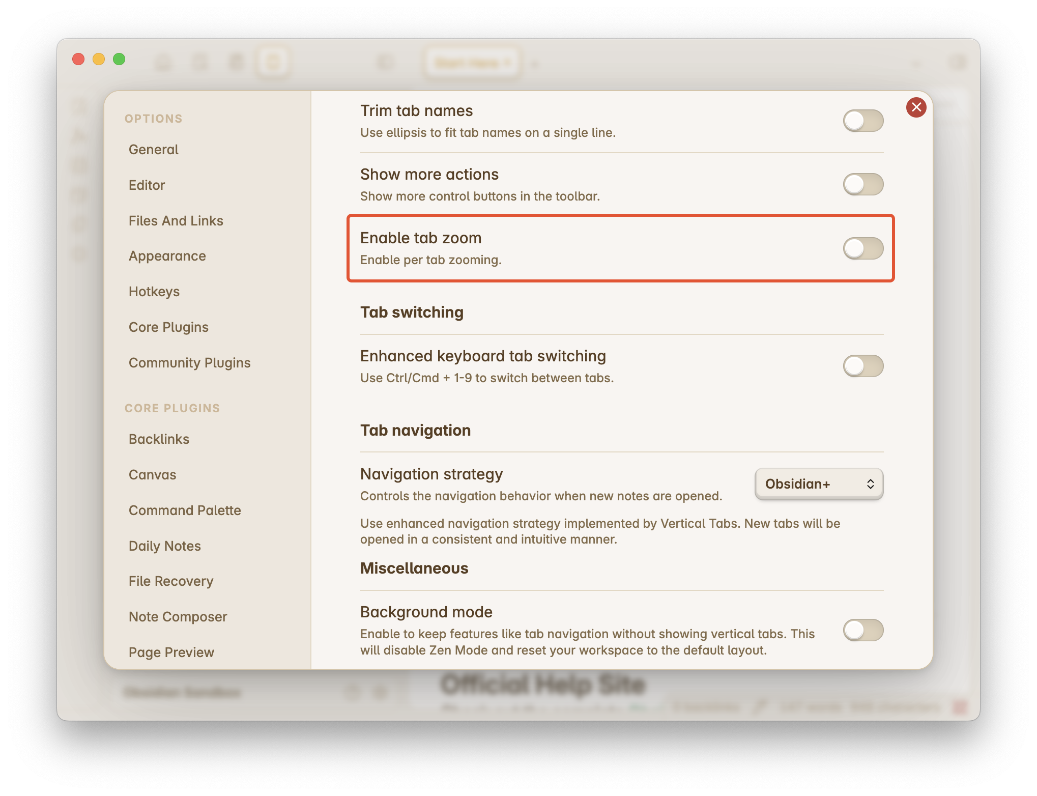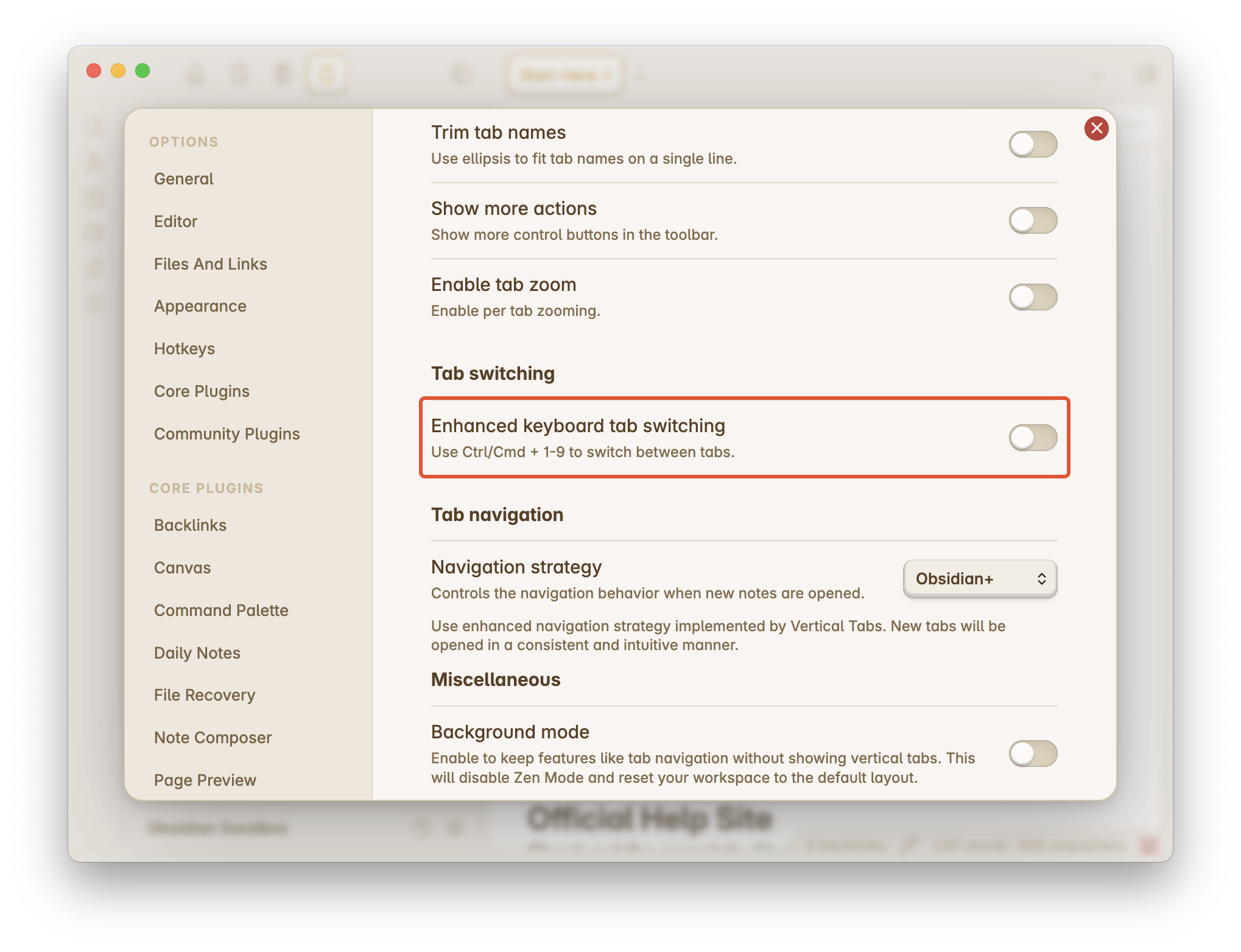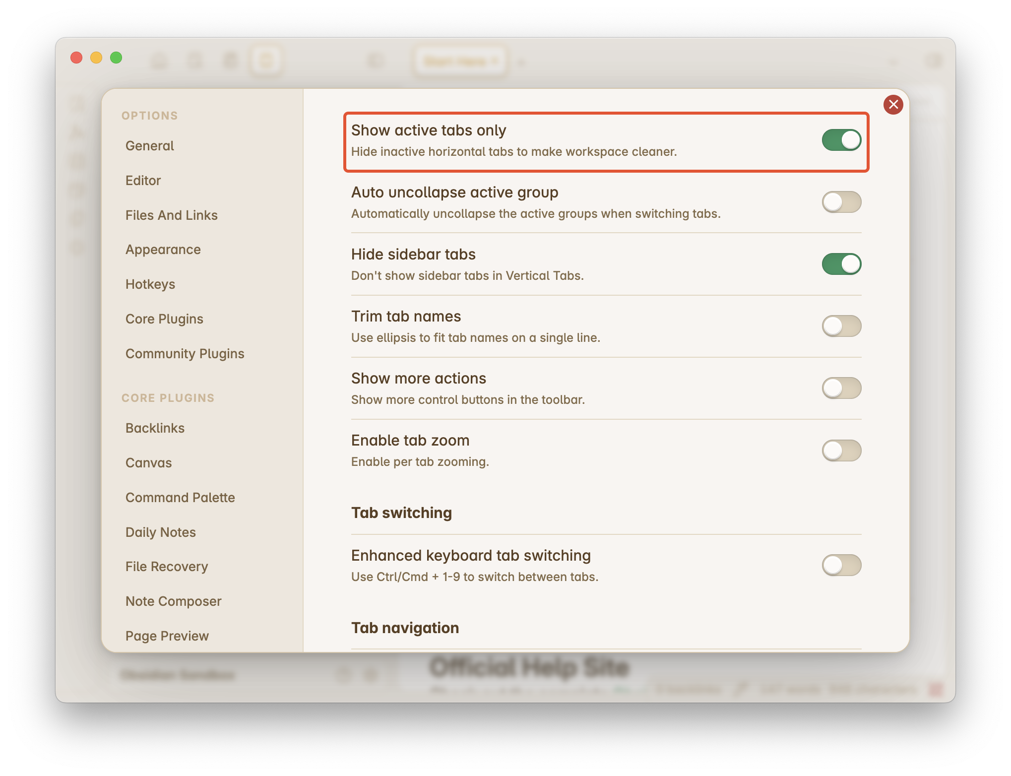 First, if you have many open notes and feel frustrated navigating between them using Obsidian’s native horizontal tabs, you may want to enable the show active tabs only toggle.