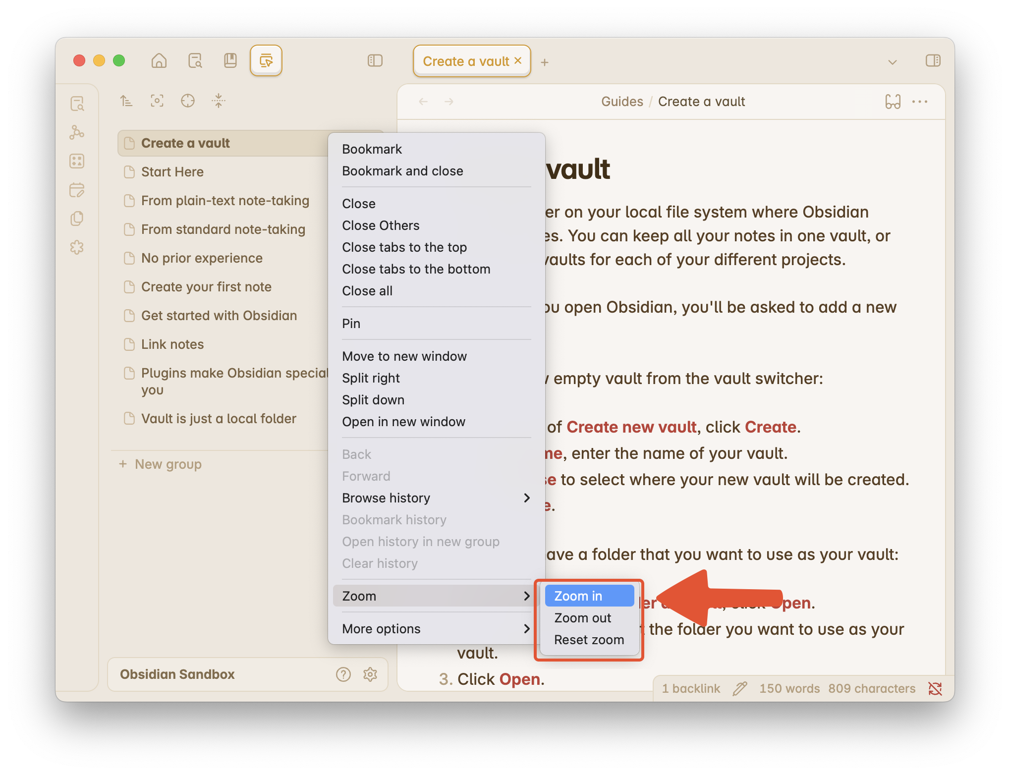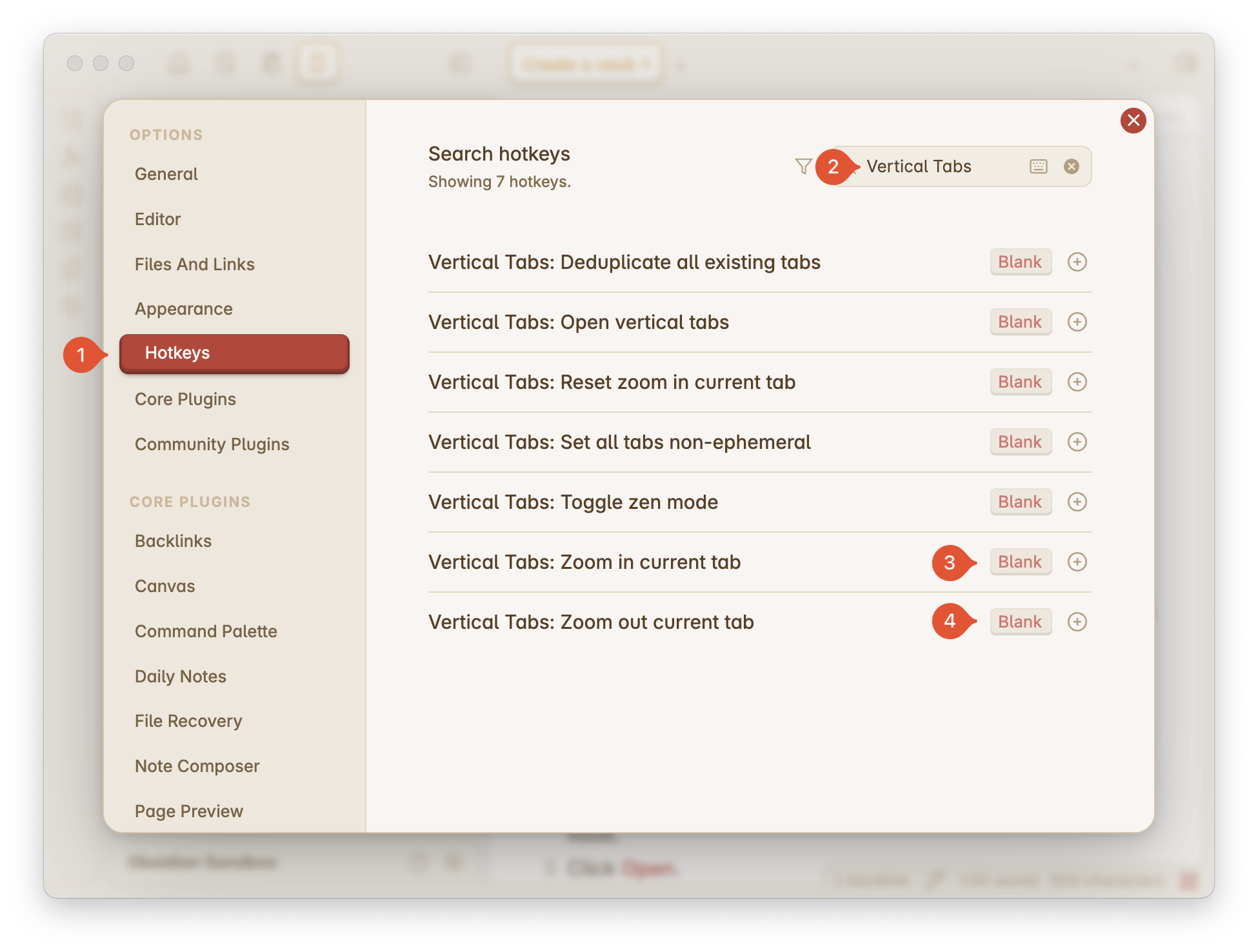 A vault is a folder of your notes in Obsidian. If you haven’t created your vault, please follow the official guide to download and install Obsidian and then create a vault. There are many great video guides online for customizing your vault. If you have multiple vaults, you need to install Vertical Tabs in each one.